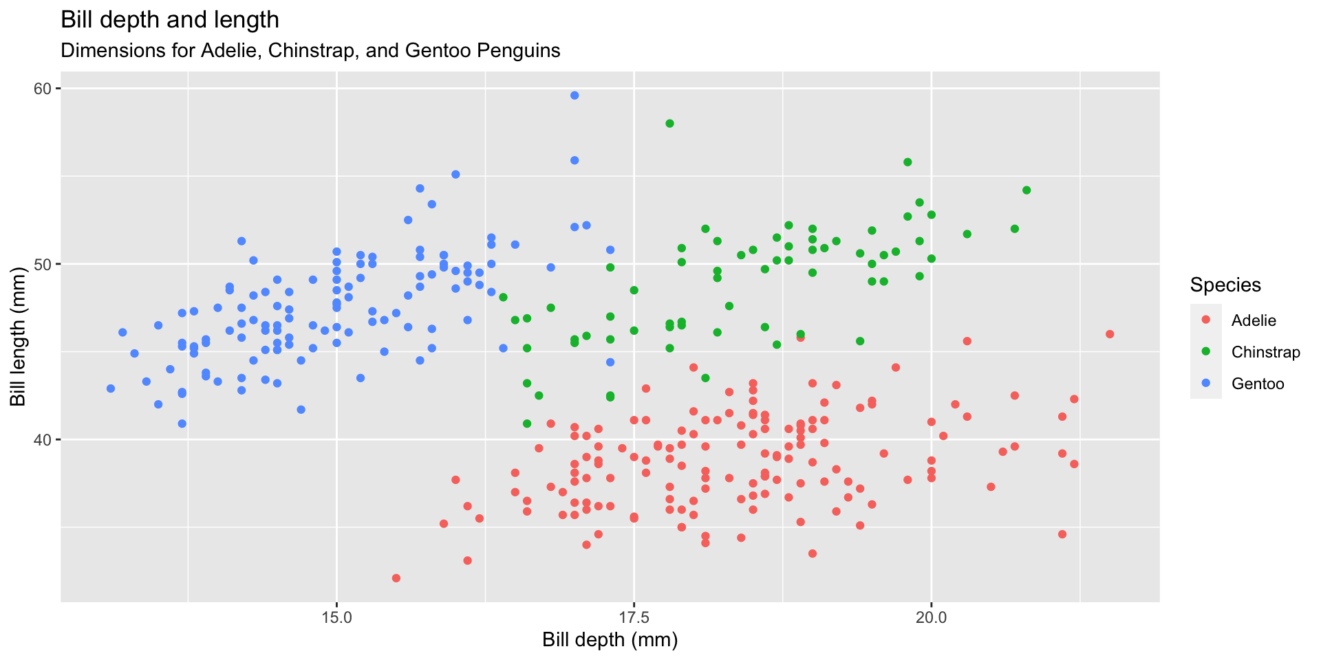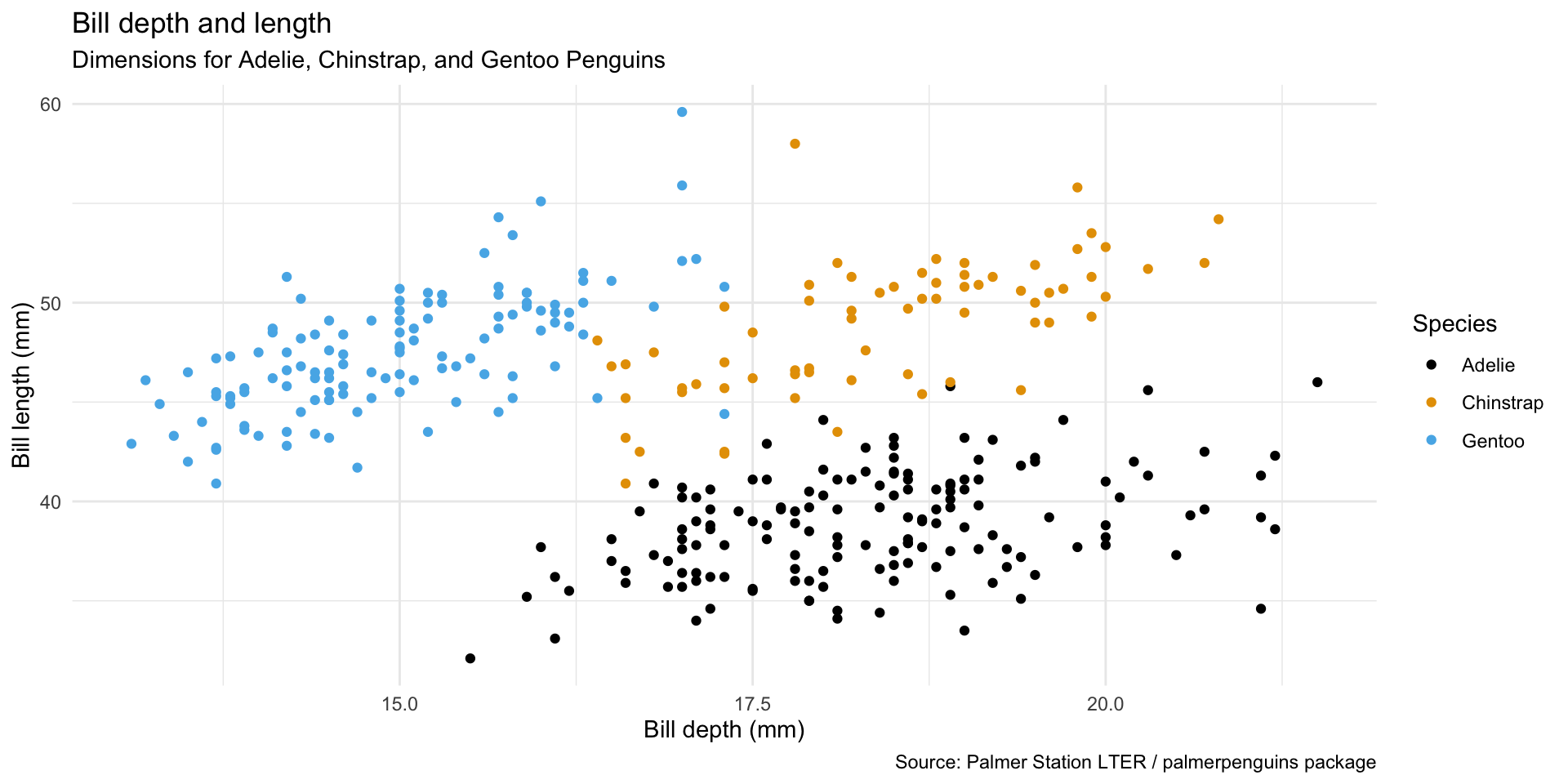 Title the plot “Bill depth and length”, add the subtitle “Dimensions for Adelie, Chinstrap, and Gentoo Penguins”, label the x and y axes as “Bill depth (mm)” and “Bill length (mm)”, respectively, label the legend “Species”, and add a caption for the data source.