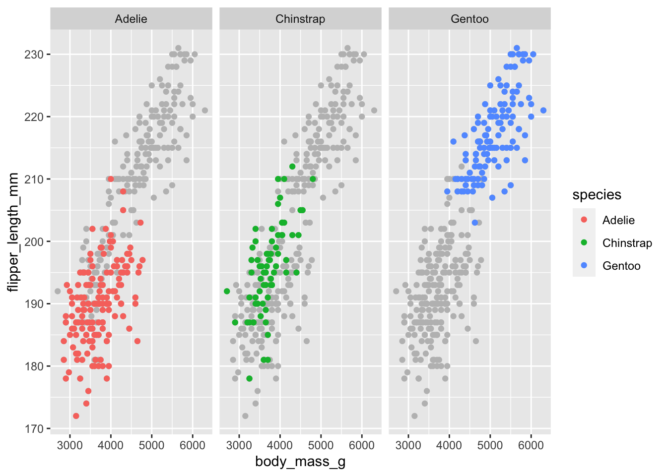 Recreate the figure below. How would you get the gray points to show up on all facets?